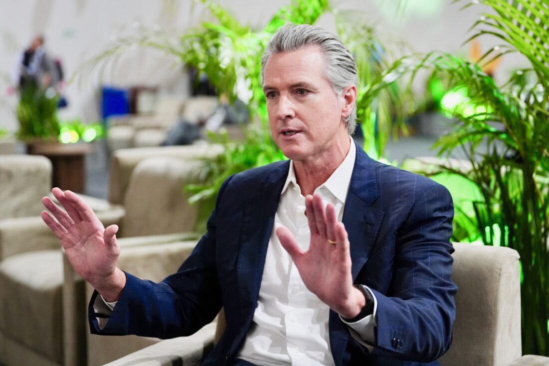 - California Gov. Gavin Newsom speaks during an interview with The Associated Press at the COP30 U.N. Climate Summit, Tuesday, Nov. 11, 2025, in Belem, Brazil. (AP Photo/Joshua A. Bickel)