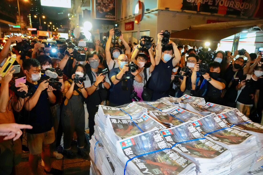 - FILE – Members of the media take photos of stacks of the last issue of Apple Daily as they arrive at a newspaper booth in Hong Kong, June 24, 2021. (AP Photo/Vincent Yu, File)