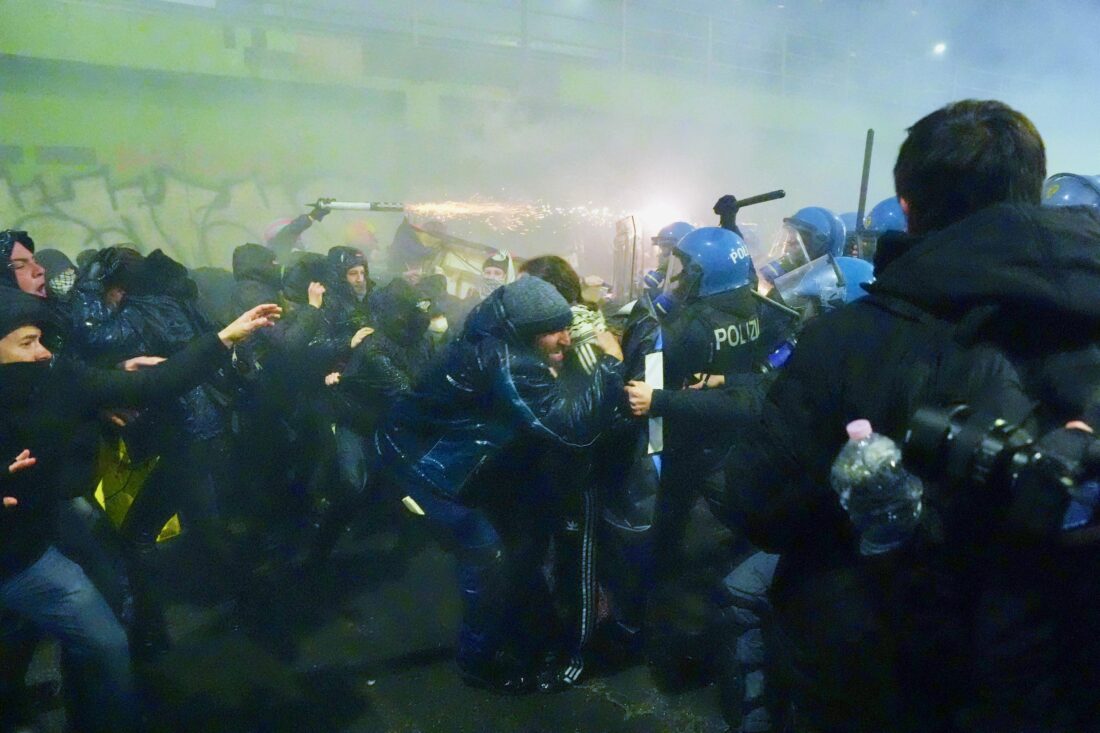 - Demonstrators clash with police during a protest against the Milan-Cortina 2026 Olympics, in Milan, Italy, Saturday Feb. 7, 2026. (Claudio Furlan/LaPresse via AP)