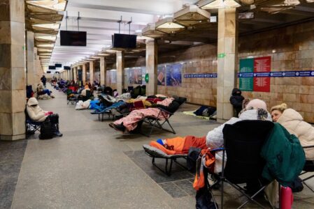 - People take shelter in a metro station, being used as a bomb shelter, during a Russian drones attack in Kyiv, Ukraine, Tuesday, Feb. 3, 2026. (AP Photo/Alex Babenko)