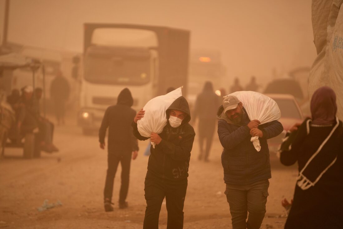 - Palestinians carry loaded sacks on their shoulders through a sandstorm in Khan Younis, southern Gaza Strip, Saturday, March 14, 2026. (AP Photo/Abdel Kareem Hana)