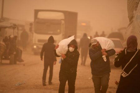 Palestinians carry loaded sacks on their shoulders through a sandstorm in Khan Younis, southern Gaza Strip, Saturday, March 14, 2026. (AP Photo/Abdel Kareem Hana)