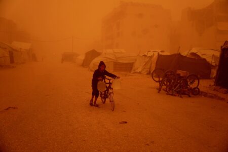 - A boy pushes a bicycle carrying jerrycans of water through a sandstorm in Khan Younis, southern Gaza Strip, Saturday, March 14, 2026. (AP Photo/Abdel Kareem Hana)