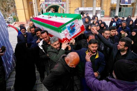 The coffin of Mehdi Hosseini, a man killed in a U.S.-Israeli strike, is carried for burial at Behesht-e Zahra cemetery in Tehran, Iran, Monday, March 9, 2026. (AP Photo/Vahid Salemi)