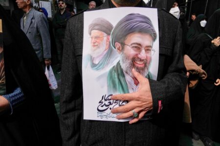 - A mourner holds a poster depicting Ayatollah Mojtaba Khamenei, right, the successor to his late father Ayatollah Ali Khamenei, left, as supreme leader, during the funeral procession for senior Iranian military officials and civilians killed during the U.S.-Israel campaign in Tehran, Iran, Wednesday, March 11, 2026. (AP Photo/Vahid Salemi)