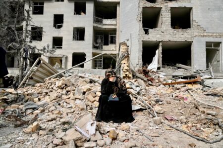 A woman sits on rubble across from a residential building damaged last Sunday during the U.S.-Israeli air campaign in Tehran, Iran, Thursday, March 12, 2026. (AP Photo/Vahid Salemi)