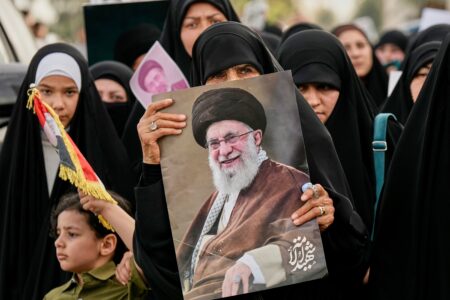 - Iraqi women hold a portrait of Iran’s late Supreme Leader Ayatollah Ali Khamenei and his son Ayatollah Mojtaba Khamenei, during a protest against U.S. and Israeli attacks on multiple cities across Iran, in the Shi’ite district of Kazimiyah in Baghdad, Iraq, Friday, April 3, 2026. (AP Photo/Hadi Mizban)