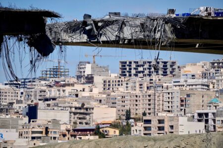 A bridge struck by U.S. airstrikes on Thursday is seen in the town of Karaj, west of Tehran, Iran, Friday, April 3, 2026. (AP Photo/Vahid Salemi)