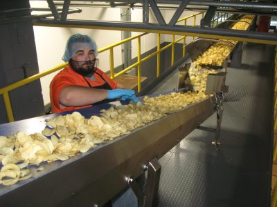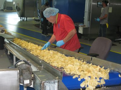 7. On both the lower and upper levels, an employee inspects the chips, looking for and removing those that are burnt, green or discolored, as well as any larger potato pieces that might have made it through.