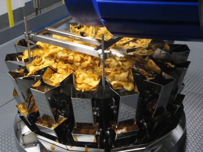 9. The chips move from the drums to scales that dispense them into receptacles that measure and drop the correct weight of chips into a series of chutes and the waiting bags below.