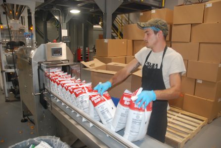 Mister Bee employee Braden Hewitt loads bags of Barbeque chips from a collator into a box.