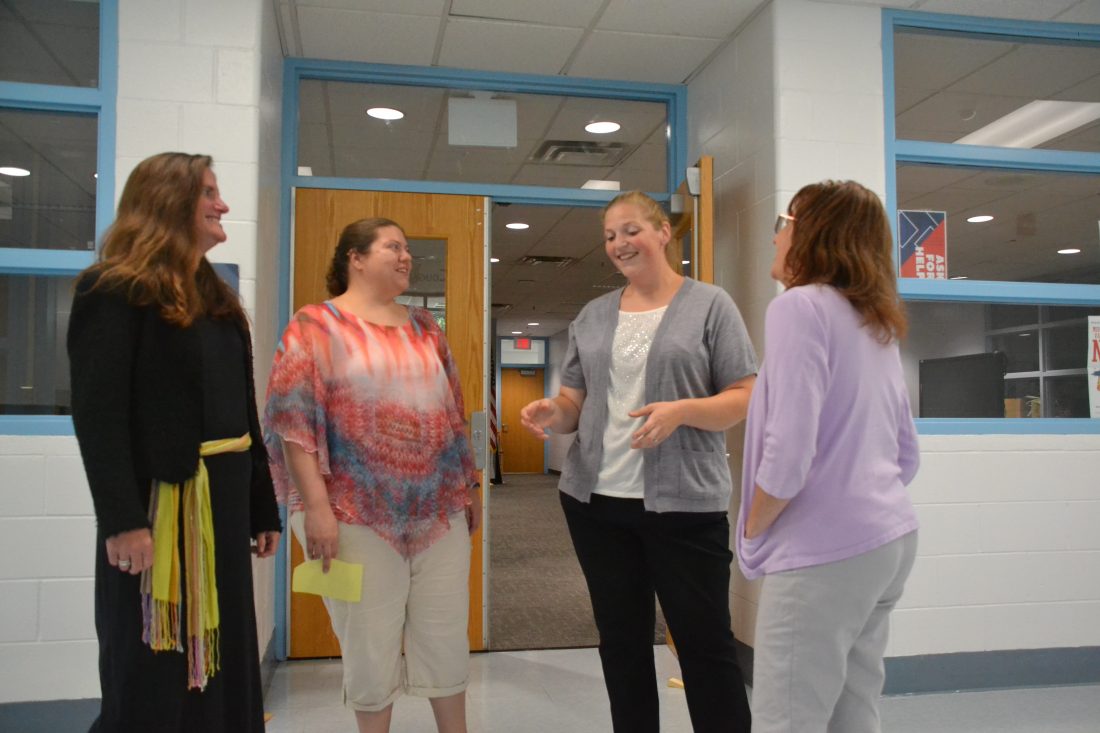 Photo by Michael Kelly Beth Brown, left, shares a moment with staff members, from left, Victoria Cassady, Laura Bank and Holly Cunningham in the hallway of Frontier High School. Brown has been principal at the school for three years, and recently added the title of superintendent for the Frontier Local school district to her duties.