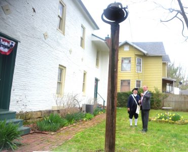 Glen Wolfe watches as Marietta Mayor Josh Schlicher rings the bell at the Henry Fearing Museum Thursday. Events were held throughout the day in celebration of the 234th anniversary of the founding of Marietta.