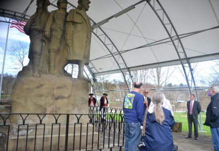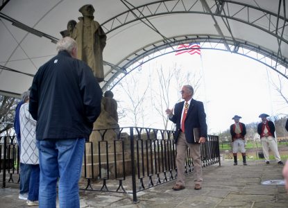 Historian Jean Yost spoke to residents Thursday about the Start Westward Monument and the settling of Marietta. Thursday was the 234th anniversary of the city’s founding. Residents gathered at the Start Westward Monument for the raising of flags provided by the Kiwanis.