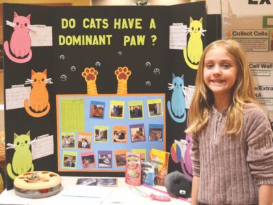 - Genevieve Taylor, a Lubeck Elementary fifth-grader, stood next to her science experiment Tuesday at the Grand Pointe Conference Center. Taylor’s experiment was to see if cats have a dominant paw. Of the 16 cats Taylor tested, seven were right pawed, seven were left pawed and two were ambidextrous. (Photo by Douglass Huxley)