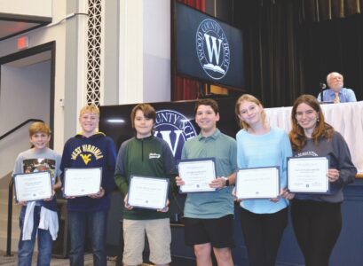 (Photo by Douglass Huxley) Students from Jackson Middle School were recognized Tuesday night by the Wood County Board of Education for their completion of i-Ready lessons. Pictured from left are Judah Moore, Brady Miller, Luke McCullough, James D’Eramo, Isabelle Collins and Savannah Smith.