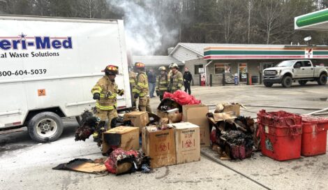 A firefighter removes boxes from a truck from Ameri-Med Medical Waste Solution that caught fire at the 7-11 on Harris Highway Thursday morning. (Photo by Art Smith)