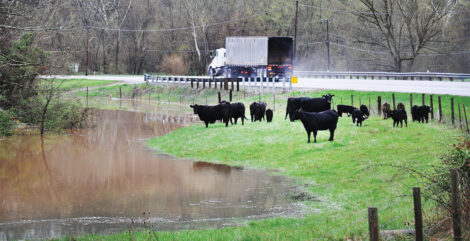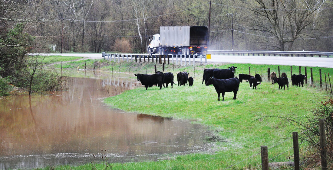 (Photo by Art Smith) A herd of cattle graze near a flooded branch of Wolf Creek along Ohio 339 between Waterford and Watertown Friday morning. Heavy rains have pushed some small streams out of their banks.