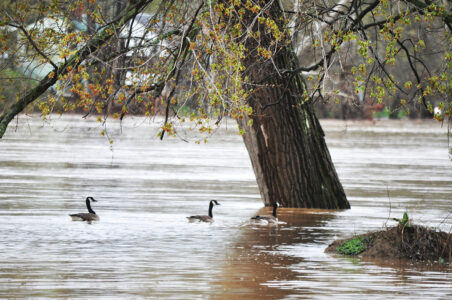 - (Photo by Art Smith) Geese swim in a swollen Muskingum River near the Beverly boat ramp Friday morning. Heavy rains have pushed the river near the top of its banks, flooding some low-lying areas.