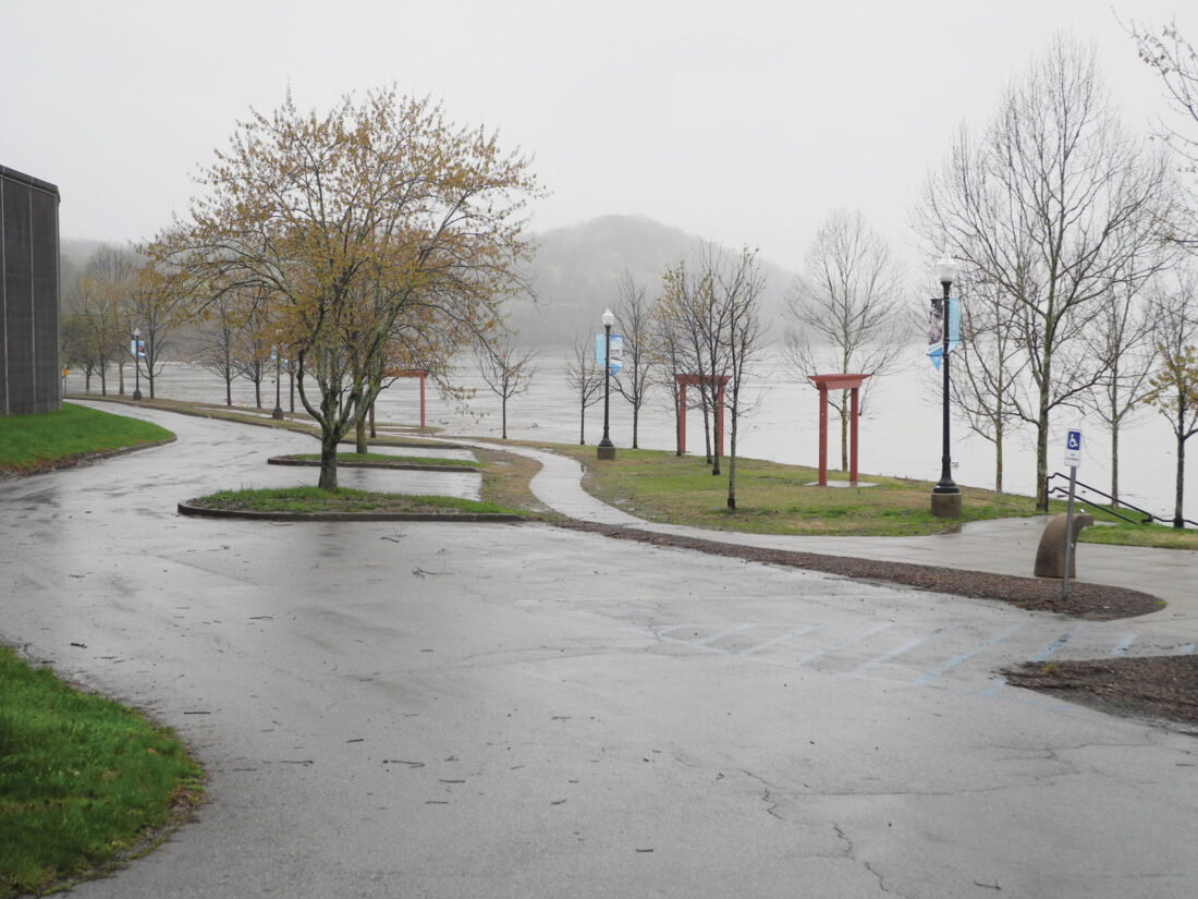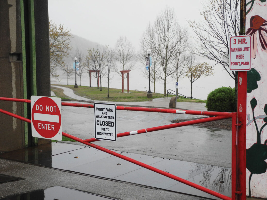 - (Photo By Jess Mancini) Point Park in Parkersburg was gated Friday morning because of high water. The point is among the first places to be affected by the rising Ohio and Little Kanawha rivers.