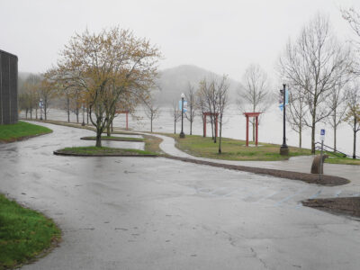 (Photo By Jess Mancini) Point Park in Parkersburg was gated Friday morning because of high water. The point is among the first places to be affected by the rising Ohio and Little Kanawha rivers.