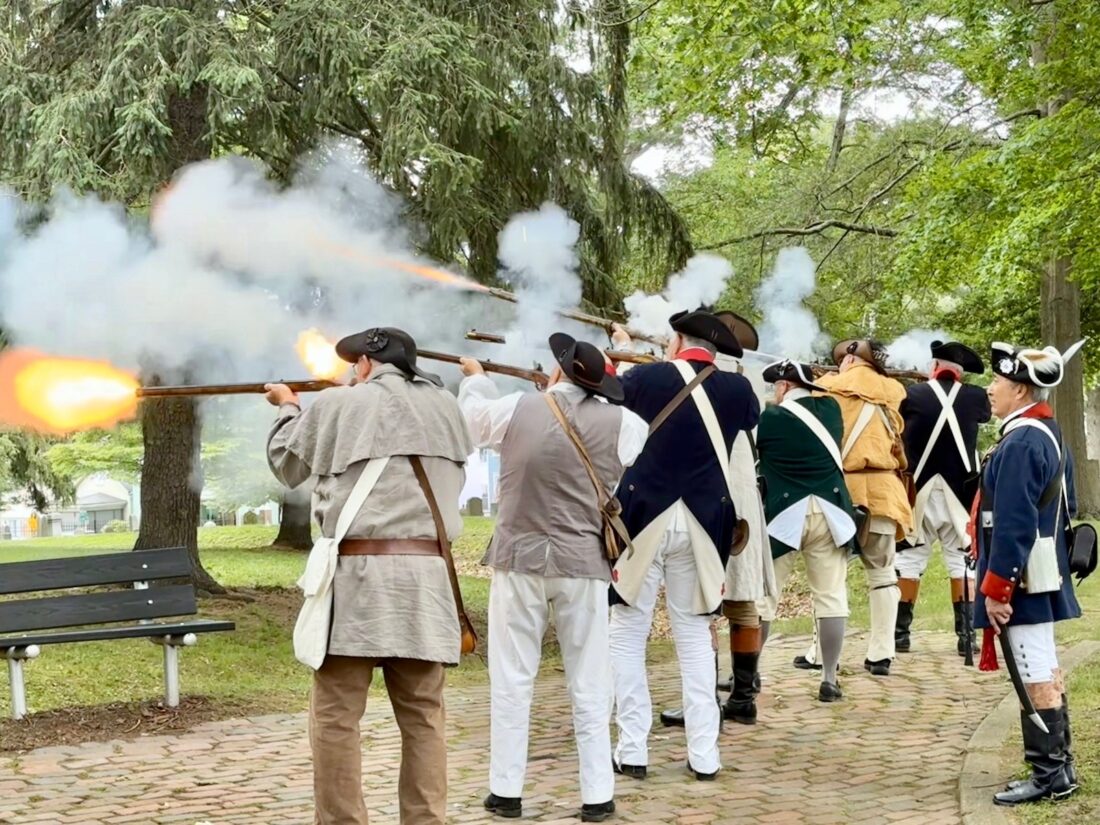 The audience then turned towards the burial mound where the musket salute concluded the memorial service. The audience was encouraged to stay for the cemetery tour given by Britton and enjoy cake with refreshments.
