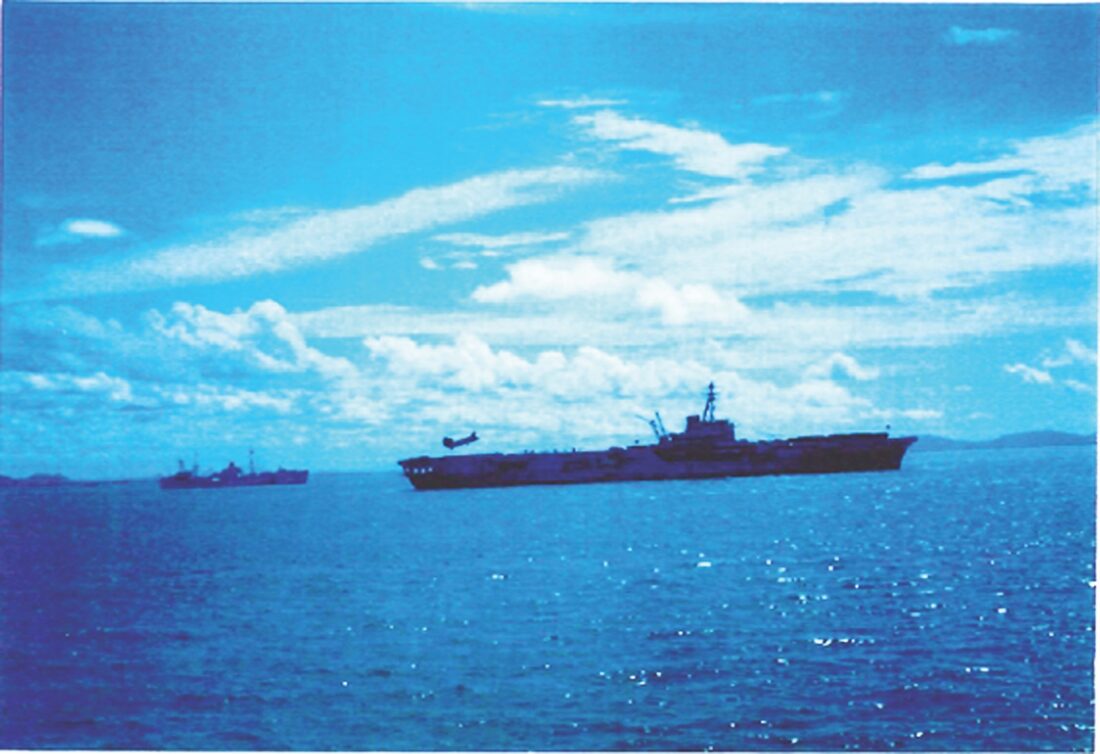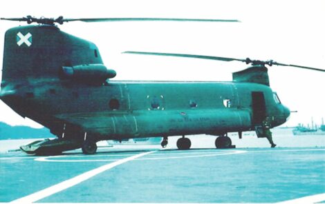 (Photo provided by Housecalls Hospice) A Chinook helicopter lands on an American naval ship to undergo repairs. Veteran Jerry Smith stated that helicopters were always landing on the ships for engine adjustments and repairs.