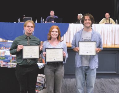 (Photo by Douglass Huxley) Students selected to attend the Governor’s Honor Academy this summer were recognized by the Wood County Board of Education Tuesday night. From left: Byron Hupp from Parkersburg High School, Audrey Smith from Parkersburg South High School and Vincent Zegrea from Williamstown High School.
