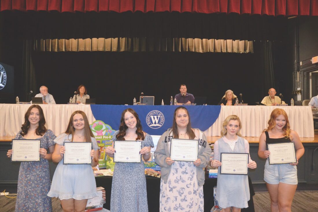(Photo by Douglass Huxley) Students selected to attend the 2025 Governor’s School For the Arts were recognized by the Wood County Board of Education Tuesday night. Pictured from left: Parkersburg South High School students Lillian Rice, Chloe Lesher, Macie Forshey, McKena Cunningham Eisley Adams-Morrison and Parkersburg High School student Hayden Carey.