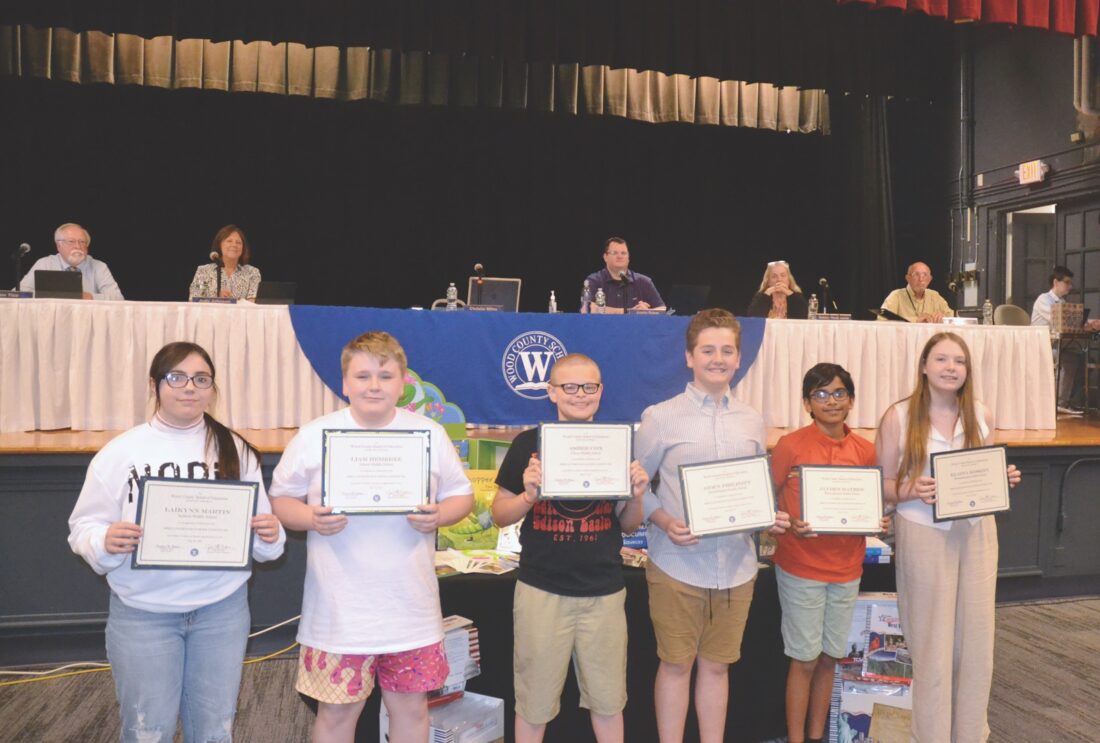 (Photo by Douglass Huxley) Students selected to attend the 2025 Governor’s STEM Institute were recognized by the Wood County Board of Education Tuesday night. From left to right, Jackson Middle School student Laikynn Martin, Edison Middle School students Liam Hembree and Asher Cox and Blennerhassett Middle School students Aiden Philpott, Jayden Mathew and Elaina Koskey.