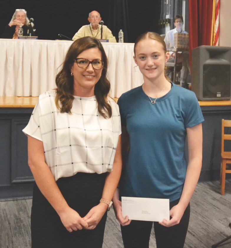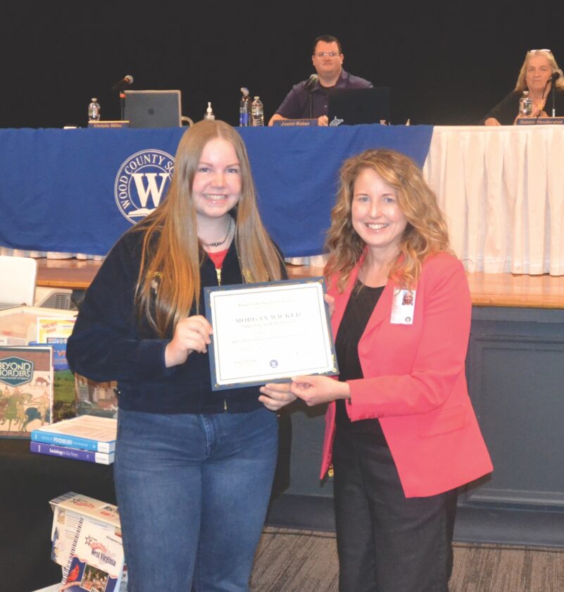 (Photo by Douglass Huxley) Parkersburg South High School student Morgan Wicker, left, was recognized by the Wood County Board of Education Tuesday night for being selected to the 2025 Governor’s School For Tourism. Also pictured is Wood County School Superintendent Christie Willis.