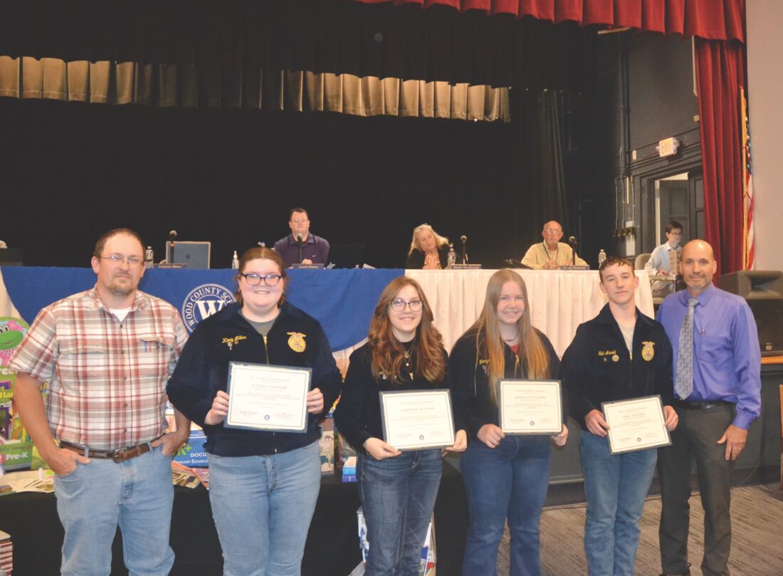 (Photo by Douglass Huxley) Students from the Wood County Technical Center were recognized by the Wood County Board of Education Tuesday night after becoming the 2025 West Virginia State FFA CDE (Career Development Event) competition winners held at West Virginia State University. This marks the first state championship for the program in two decades. Pictured from left: Agricultural Education Instructor Ben Goff, Kloey Miller, Addison Haines, Morgan Wicker, Neil Arnold and Director Jason Hughes