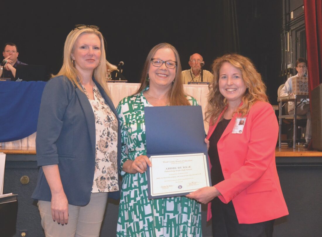 - (Photo by Douglass Huxley) Parkersburg South High School art teacher Abbie Burge, center, was recognized by the Wood County Board of Education Tuesday night for being selected as the 2025 Janet Frazier Award For Excellence recipient. Also pictured is South Principal Maria Fransico and Superintendent Christie Willis.
