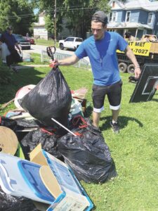 - (Photo by Brett Dunlap) Denver Jordan with the Mid-Ohio Valley Fellowship Home takes out trash Friday as volunteers participate in the United Way of the Mid-Ohio Valley’s annual Day of Action. Volunteers with the home and six people from Celanese helped clear out the home’s attic space so the space can eventually be used for services within the home. Jordan said he was giving back to the Fellowship Home for everything they are doing for him.