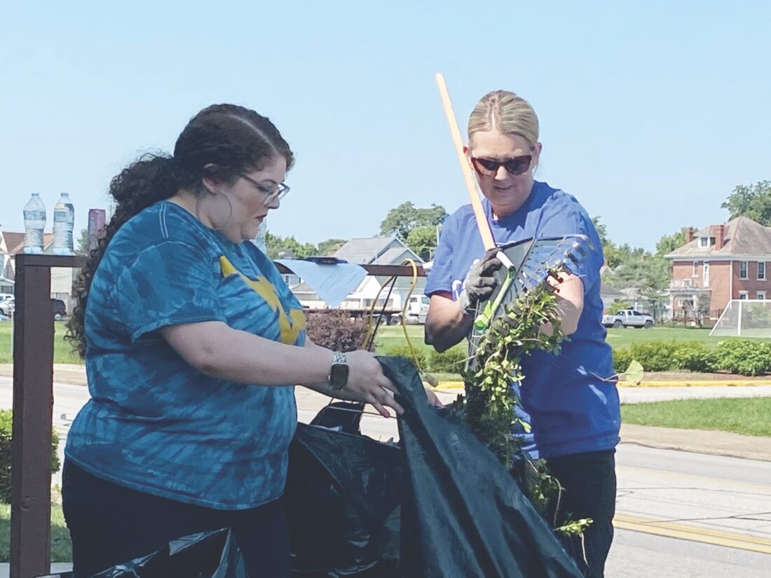- (Photo by Brett Dunlap) Emily Ghonimy holds a trash bag while Melinda Hall put yard waste in as a crew with the WVU Medicine Camden Clark Medical Center help do some landscaping work and more at the new administrative offices for Wood County Senior Citizens on Dudley Avenue on Friday as part of the United Way of the Mid-Ohio Valley’s annual Day of Action.