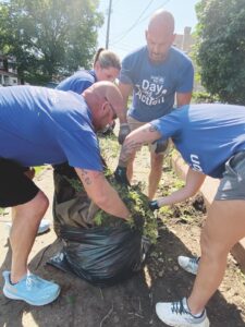 (Photo by Brett Dunlap) A crew from WVU Medicine Camden Clark Medical Center puts yard cuttings and more into a trash bag at the new administrative offices for Wood County Senior Citizens on Dudley Avenue on Friday as part of the United Way of the Mid-Ohio Valley’s annual Day of Action. Volunteers went out into the community to around 20 sites and helped with a number of service projects for a number of local non-profits. Camden Clark had six teams out.