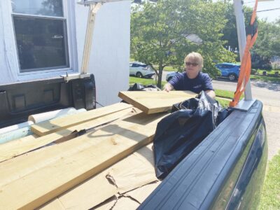- (Photo by Brett Dunlap) Amanda Deems of Highmark loads wood into a pickup truck Friday at a job site on Plum Street in Parkersburg. A group of six women from Highmark helped with work on a Habitat For Humanity house built Friday as part of the United Way of the Mid-Ohio Valley’s annual Day of Action where volunteers did work around the community.