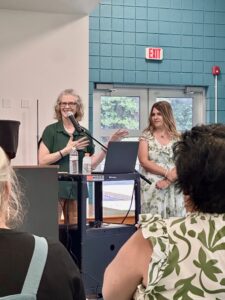 (Photo by Tristan Hostetter, Special to the Times) Wellsville Local Schools music teacher and artist Lindsay Clifton, right, did a reading and book signing of her book, “Middle Fingers of Love: The Granny Files,” at the Ursuline Motherhouse in Canfield on Saturday. At left is her friend, Kelly Bancroft.