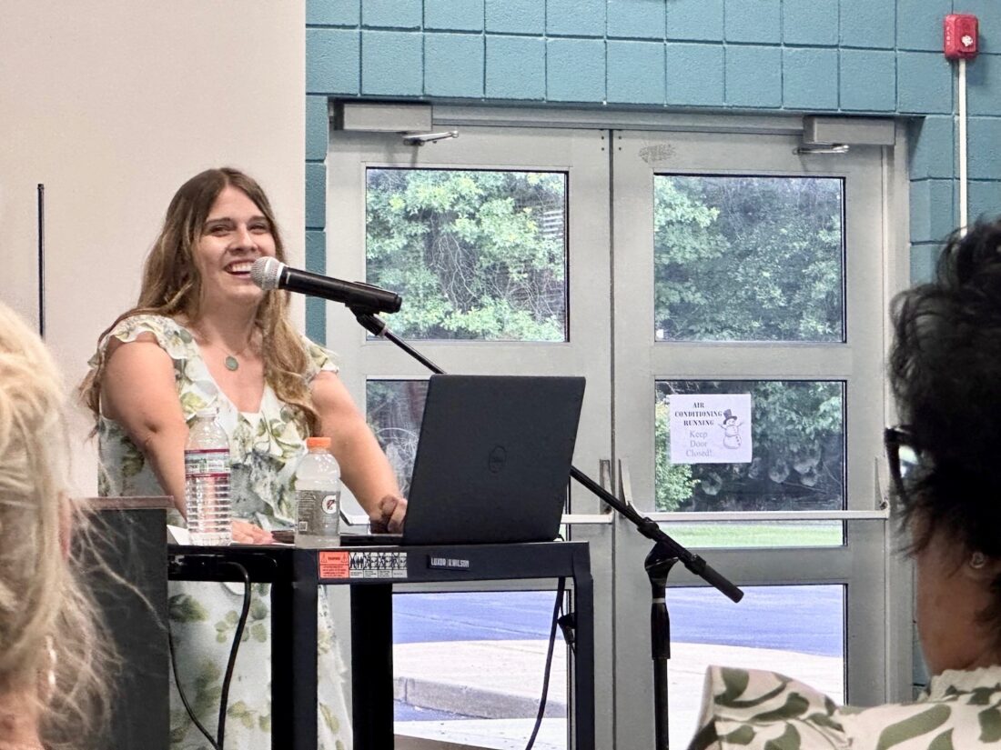 (Photo by Tristan Hostetter, Special to the Times) Wellsville Local Schools music teacher and artist Lindsay Clifton of Steubenville shows off her book, “Middle Fingers of Love: The Granny Files,” which chronicles a series of vignettes in comic style about a granddaughter’s journey caring for her grandmother. She gave a reading and book signing at the Ursuline Sisters Motherhouse in Canfield on Saturday.