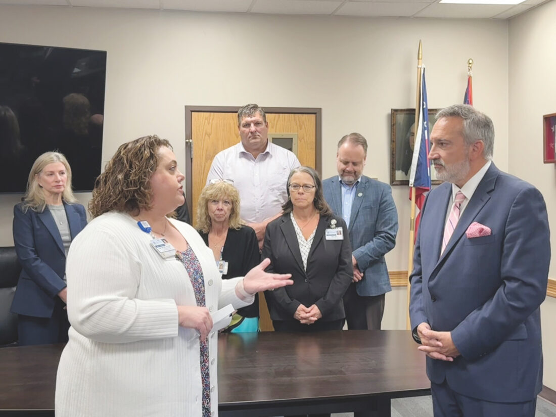 - (Photo by Amber Phipps) Memorial Health Systems Chief Nurse and Hunger Solutions Board Member Paige Smith, left, speaks to Washington County Department of Jobs and Family Services Director Flite Freimann, right, about the donation made to support the Southeast Ohio Food Bank on Thursday.