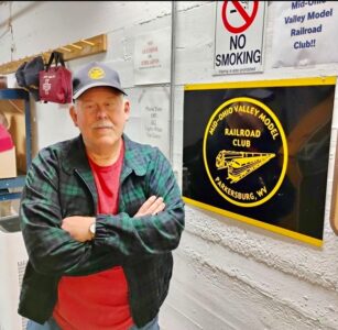 - (Photo by Mark Suek) Fall Train Show Chairman Tom Ratkovich poses in front of the Mid-Ohio Valley Model Railroad Club’s logo sign. Ratkovich will be serving as chairman for the final time on Saturday.