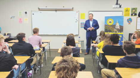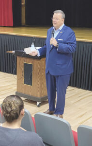 (Photo provided) West Virginia Secretary of State Kris Warner speaks to students at Wood County Christian School Wednesday about the importance of voting.