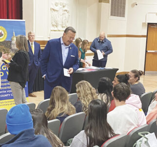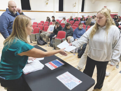 (Photo by Brett Dunlap) Alisha Cross, chief election deputy clerk for the Wood County Clerk’s Office, takes voter registration forms from students at Parkersburg High School Wednesday. West Virginia Secretary of State Kris Warner spoke to the students about the importance of voting.