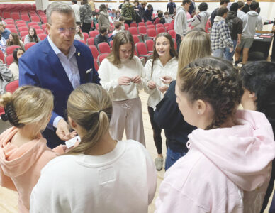 (Photo by Brett Dunlap) West Virginia Secretary of State Kris Warner interacts with students at Parkersburg High School Wednesday after speaking to them about the importance of being involved in the political process and registering to vote.