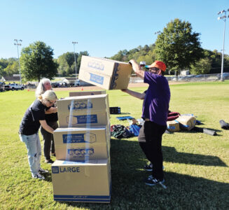 (Photo by Gwen Sour) From left, Julie White, Rachel Capps and Kevin White build their shelter for the 10th Annual Sleep Out, hosted by The Children’s Home Society of West Virginia.