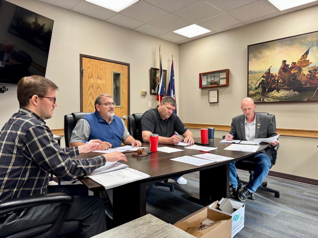 (Photo by Amber Phipps) Washington County Clerk Ben Cowdery and Washington County Commissioners Charlie Schilling, Eddie Place and James Booth review new agenda items during the regular meeting on Thursday.