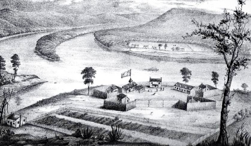 (Image from Samuel Hildreth’s Pioneer History) Sketch of Fort Harmar. Garden area is in the foreground.