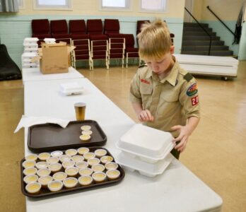 - (File Photo) Boy Scout Troop 203 member Caleb Mackie added gravy to Thanksgiving meals prepared at the Norwood United Methodist Church in Marietta, in 2024.