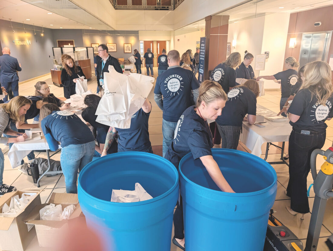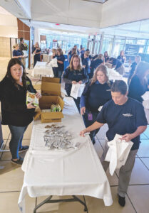 (Photo by Evan Bevins) Highmark employees gather items to place in snack bags for Mountaineer Food Bank’s Veterans Table program Wednesday at the company’s West Virginia corporate headquarters in Parkersburg. Highmark also announced its (un)Hungry campaign to fight food insecurity.