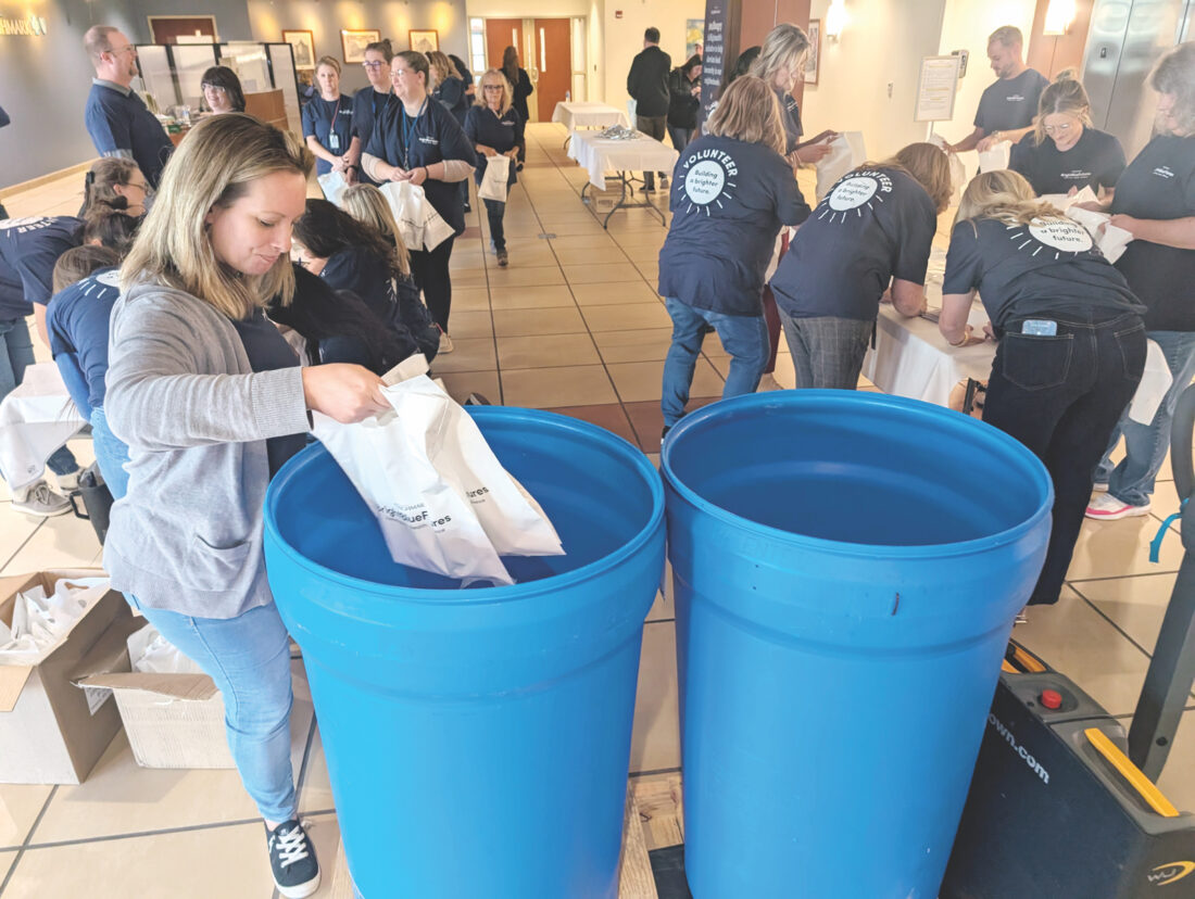 (Photo by Evan Bevins) Ashley Snyder, client services manager at Highmark, places snack bags for Mountaineer Food Bank’s Veterans Table program in a barrel Wednesday at the company’s West Virginia corporate headquarters in Parkersburg. Highmark also announced its (un)Hungry campaign to fight food insecurity.
